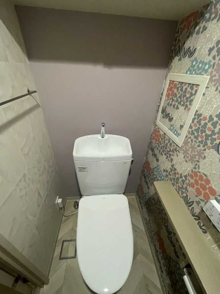 お選びいただいた製品はTOTO製ピュアレストQRです。ウォシュレットはTOTO製アプリコットF1です。室内の内装も貼り替えました。明るく華やかにしたいとのことで花柄にされました。