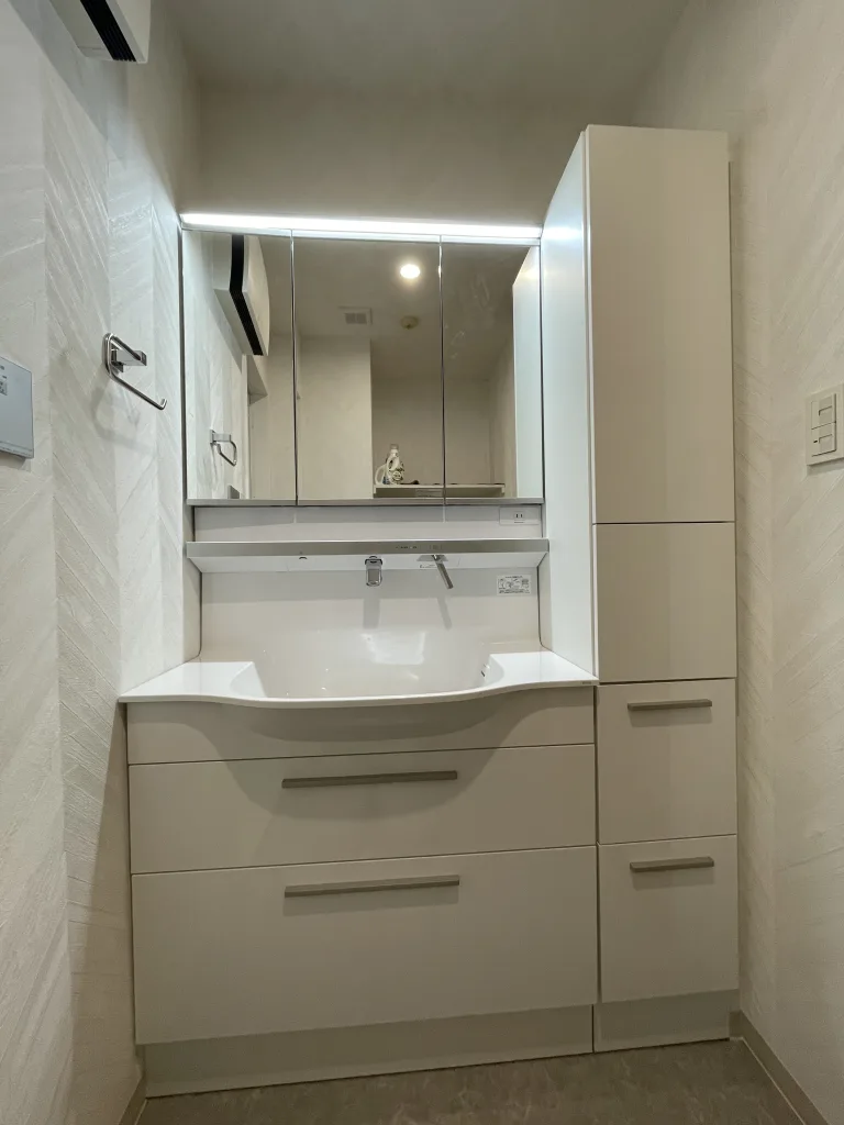 洗面台はTOTO製オクターブスリムです。既存の幅が120cmでした。収納を増やしたいご希望でしたので幅90cmの洗面台と幅30cmの収納棚のプランにしました。