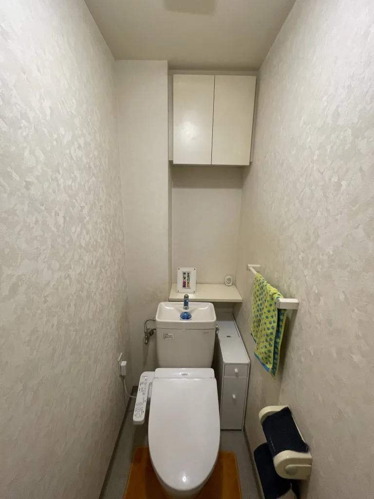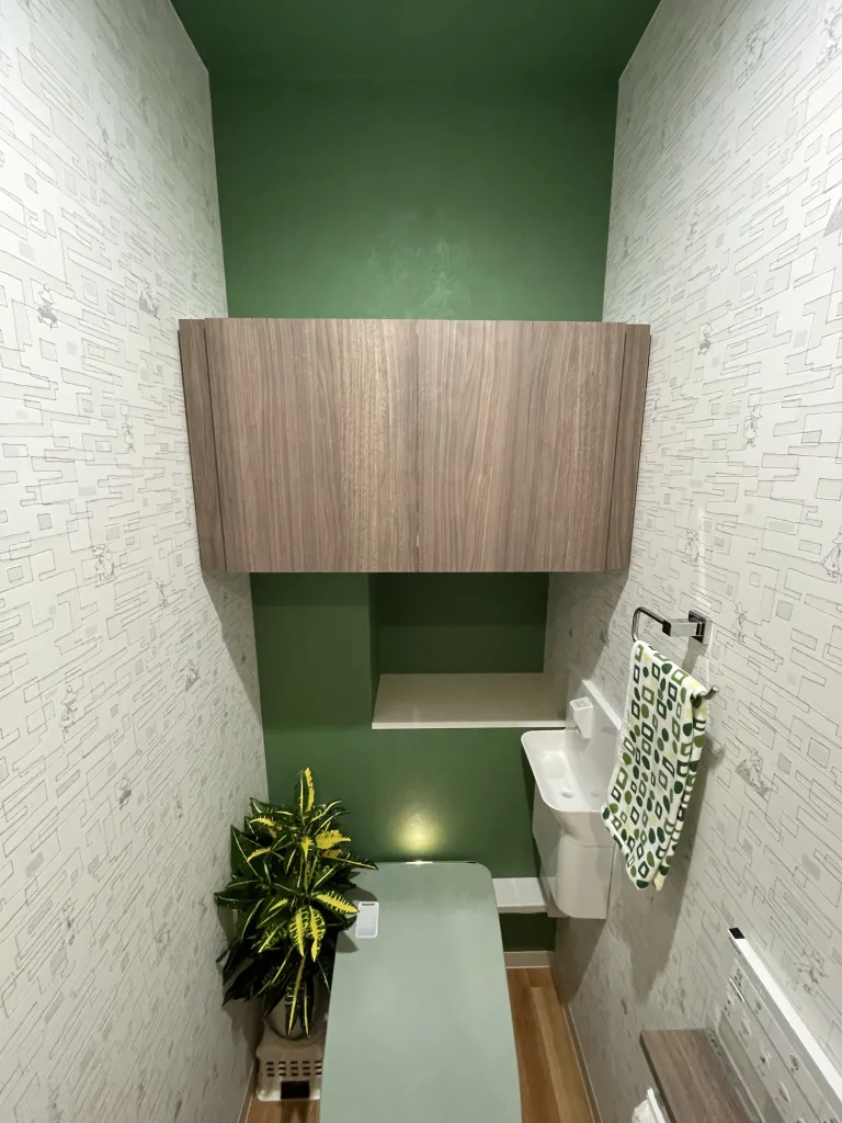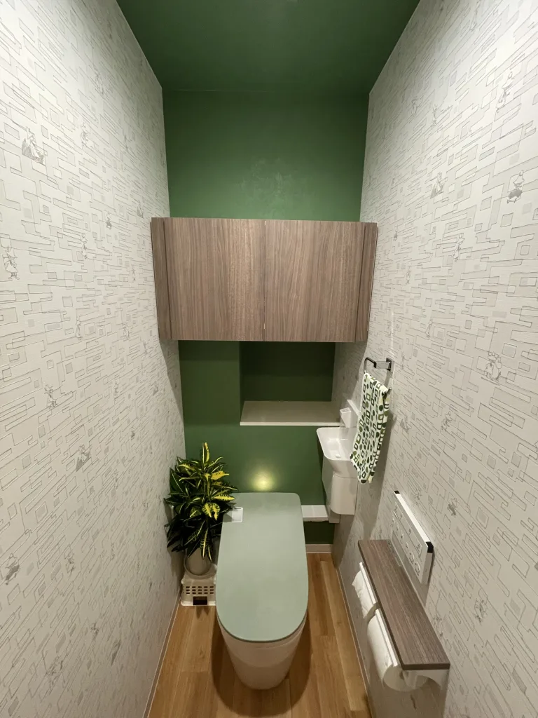 トイレは全自動お掃除トイレのPanasonic製アラウーノL150タイプ1です。手洗器を横に設置しました。室内の内装も貼り替えました。天井と背面のクロスはグリーン、トイレのフタもグリーンにしました。両サイドのクロスはムーミン柄です。以前は収納棚の幅が狭く、位置が高いのが不満なので改善したいとのことでした。高さを下げ、壁を造作して柱の手前に設置して幅も広げました。