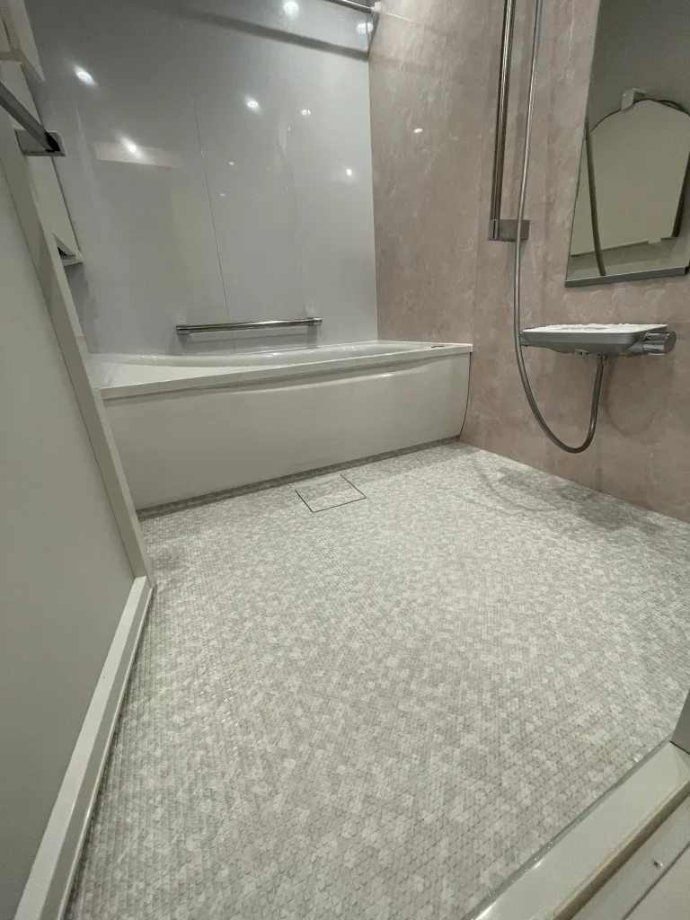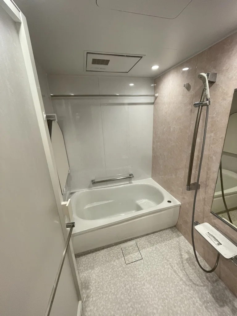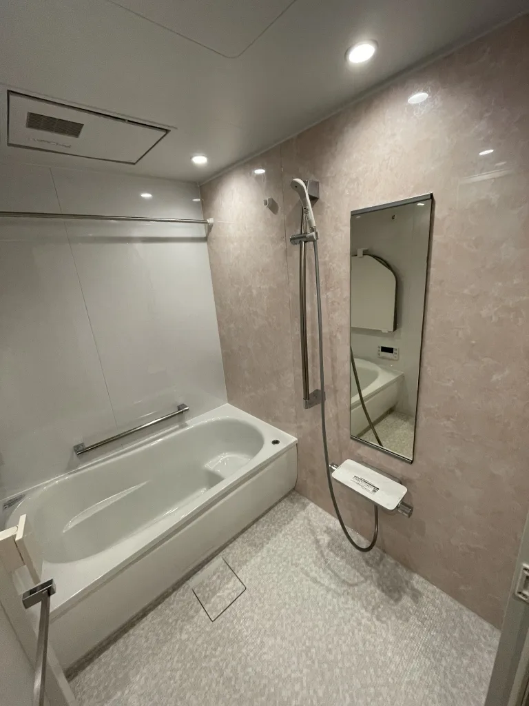 同じマンションで以前に弊社でリフォームをしていただいたお客様からご紹介をいただきました。ユニットバスはTOTO製WYシリーズXタイプです。壁は大理石柄のピンクでとても華やかになりました。