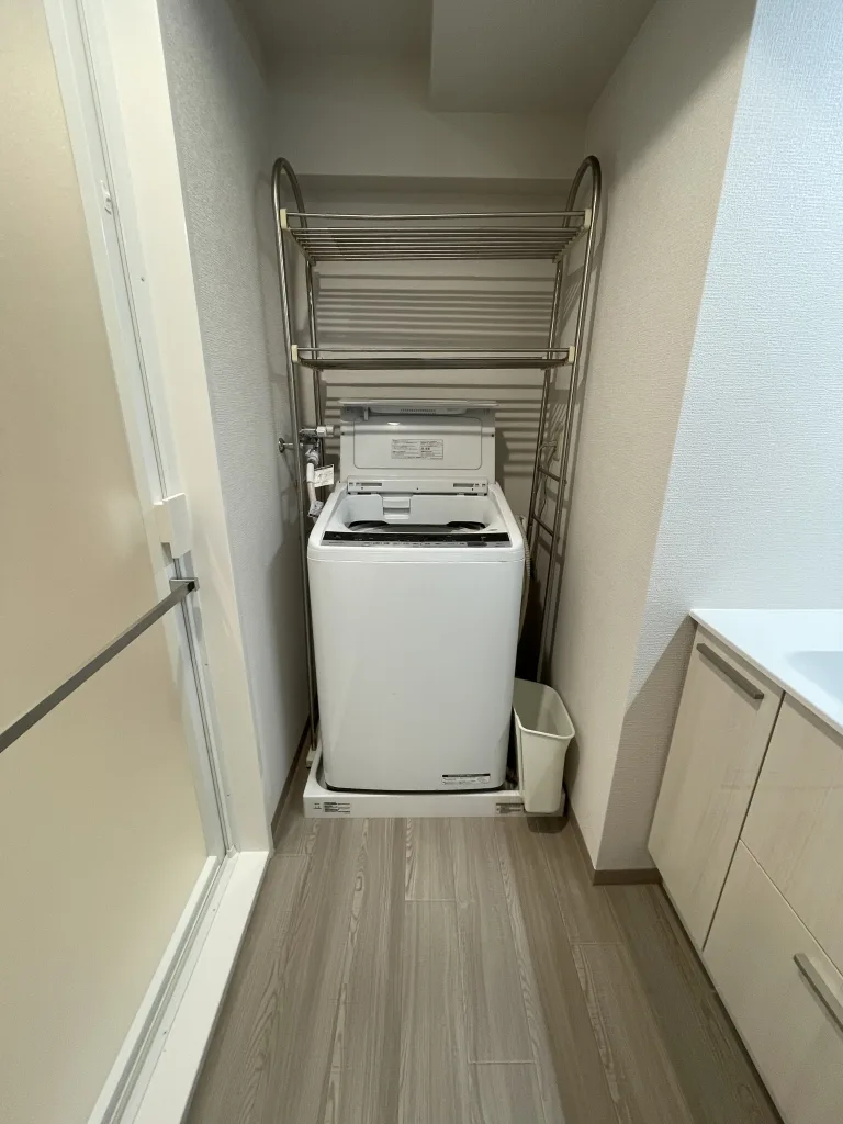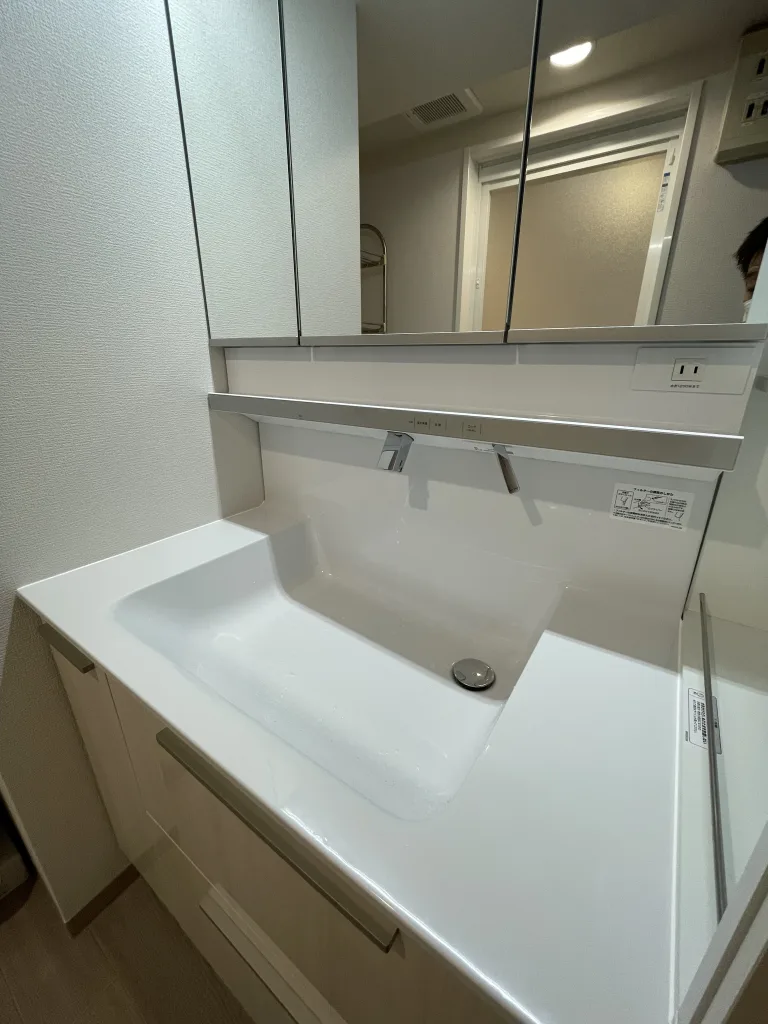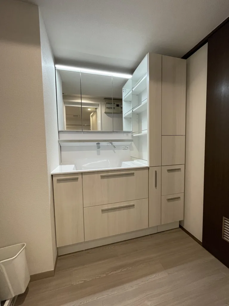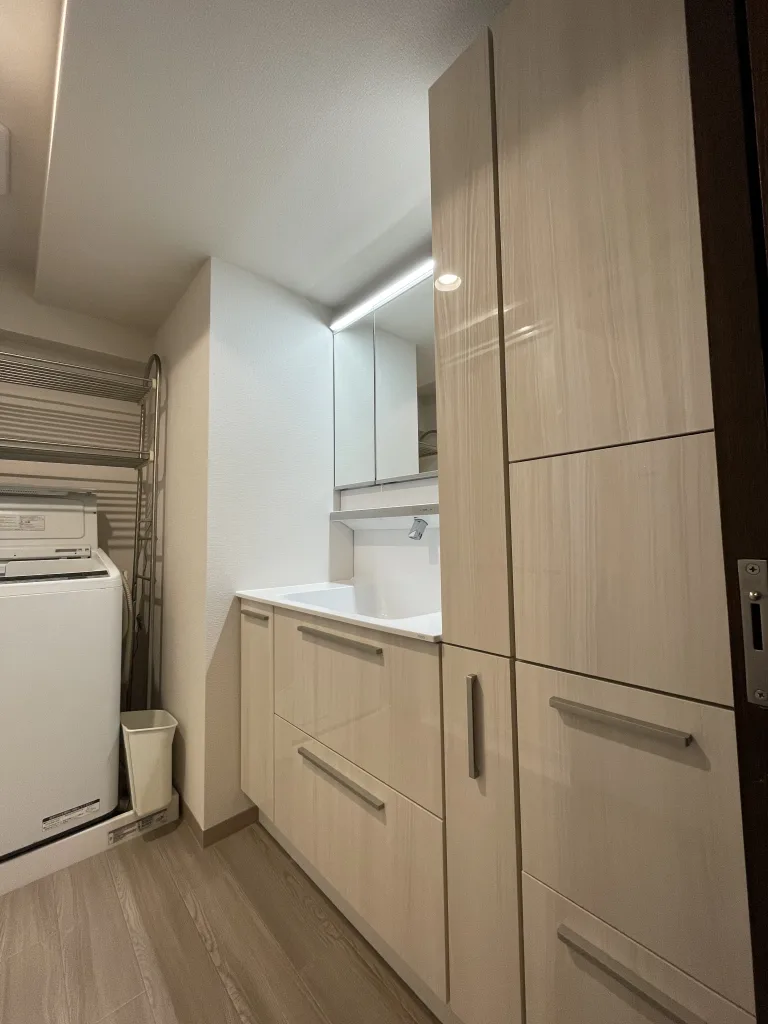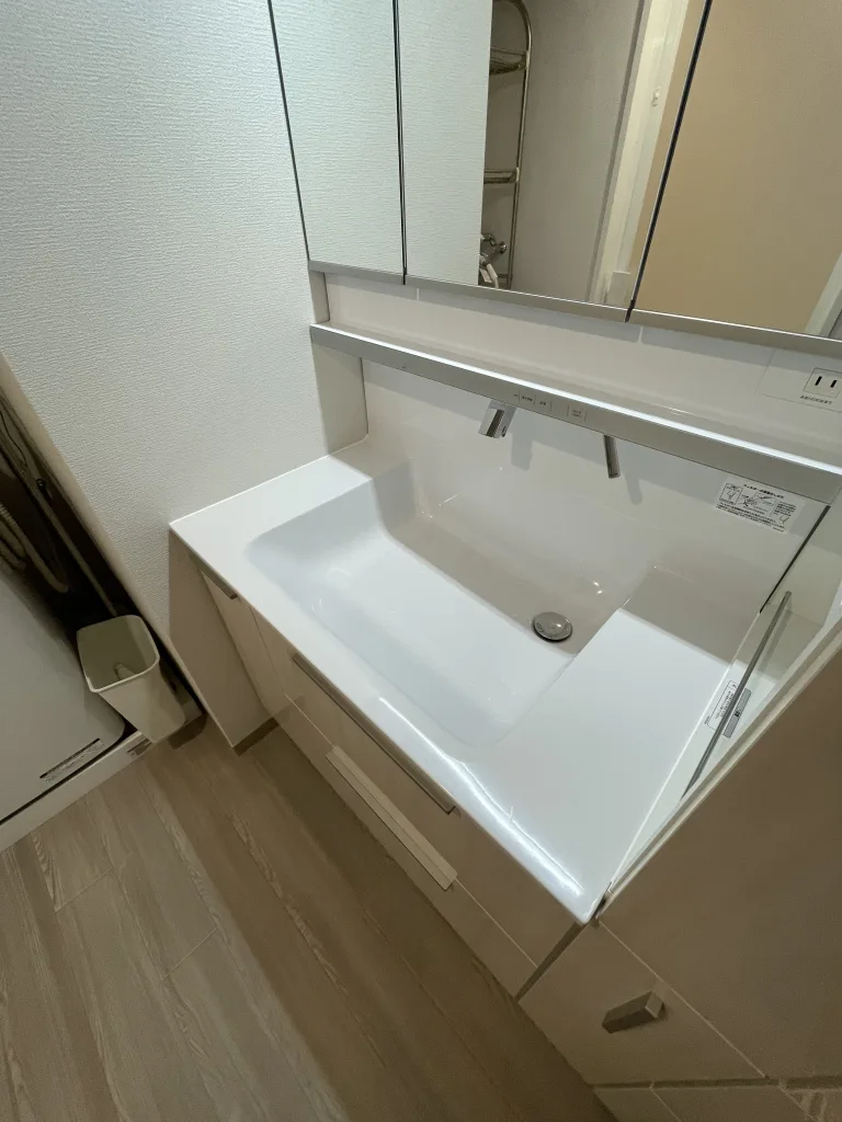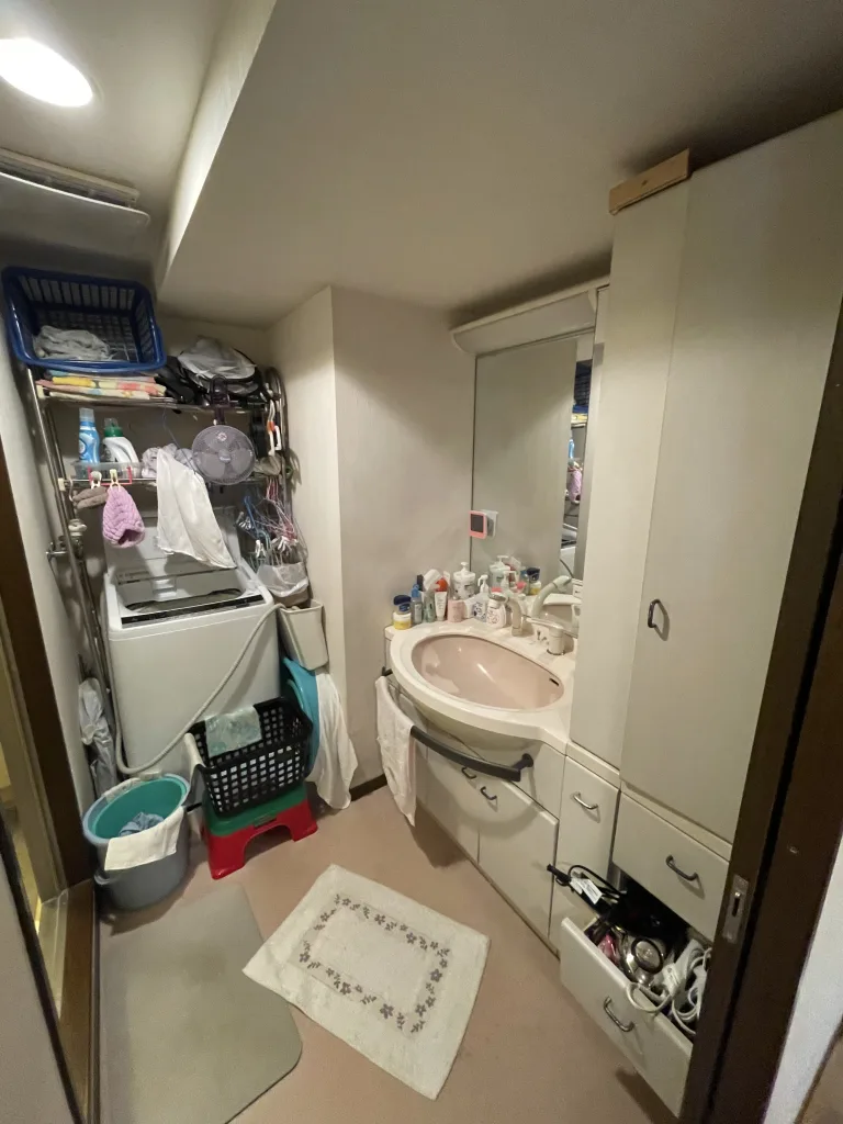 お選びいただいた製品はTOTO製オクターブです。洗面台横の収納棚もセットで新しくしました。洗面所内の内装(天井・壁・床)、防水パン、洗濯水栓交換もしました。