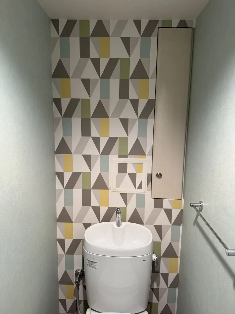 お選びいただいた製品はTOTO製ピュアレストEXです。便座はTOTO製ウォームレットGです。室内の内装も貼り替えました。グリーンをベースに柄物のアクセントで爽やかな空間になりました。