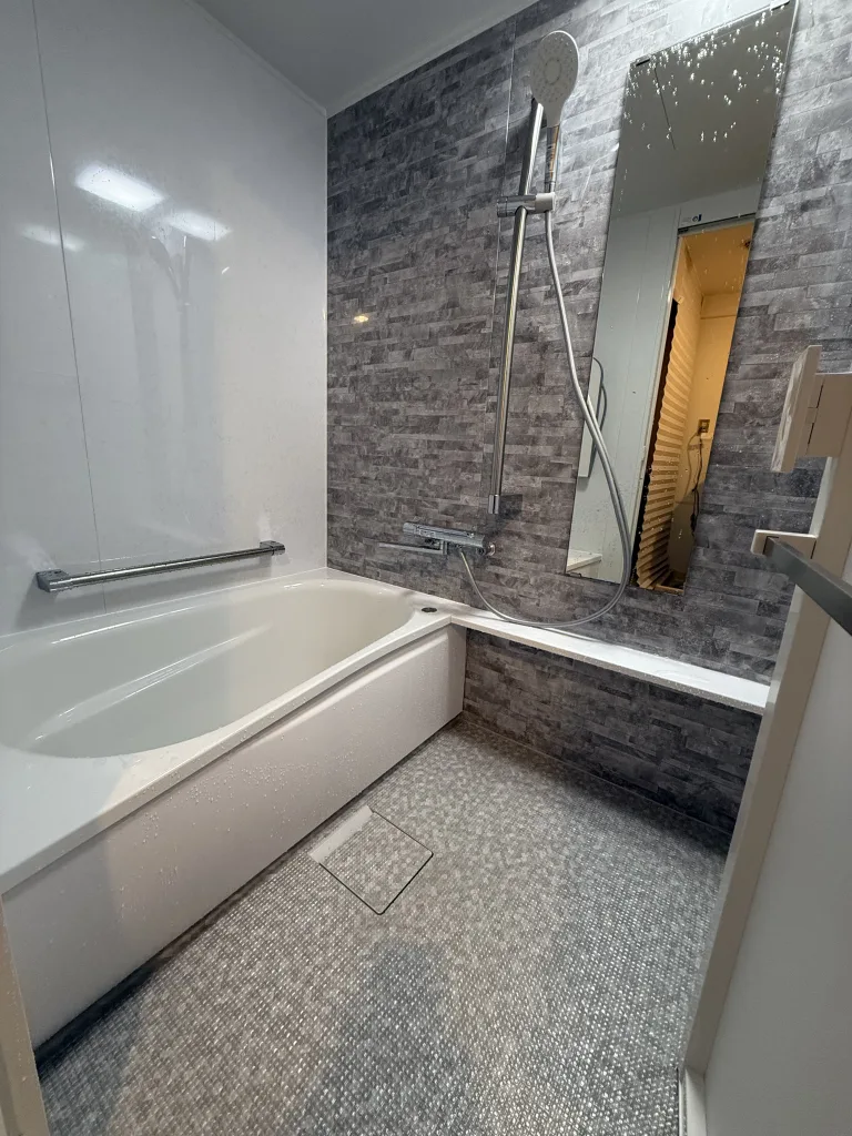 以前のお風呂は断熱材も入っていないので、すぐに浴槽のお湯は冷めていました。追い焚きがないので今回は高断熱浴槽のTOTO製WYシリーズでリフォームしました。床にも断熱材が入っていますので、冬も暖かいです。浴槽は断熱フタをすれば5時間経っても2.5度くらいしか下がりません。壁は高級感のあるクレアライトグレーにしました。