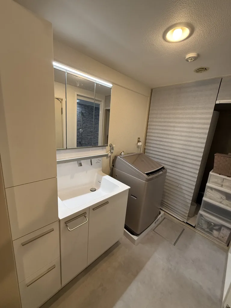 お選びいただいた製品はTOTO製オクターブです。洗面台の左に収納棚を設置しました。洗面所内の床貼り替え、防水パン、洗濯水栓交換もしました。