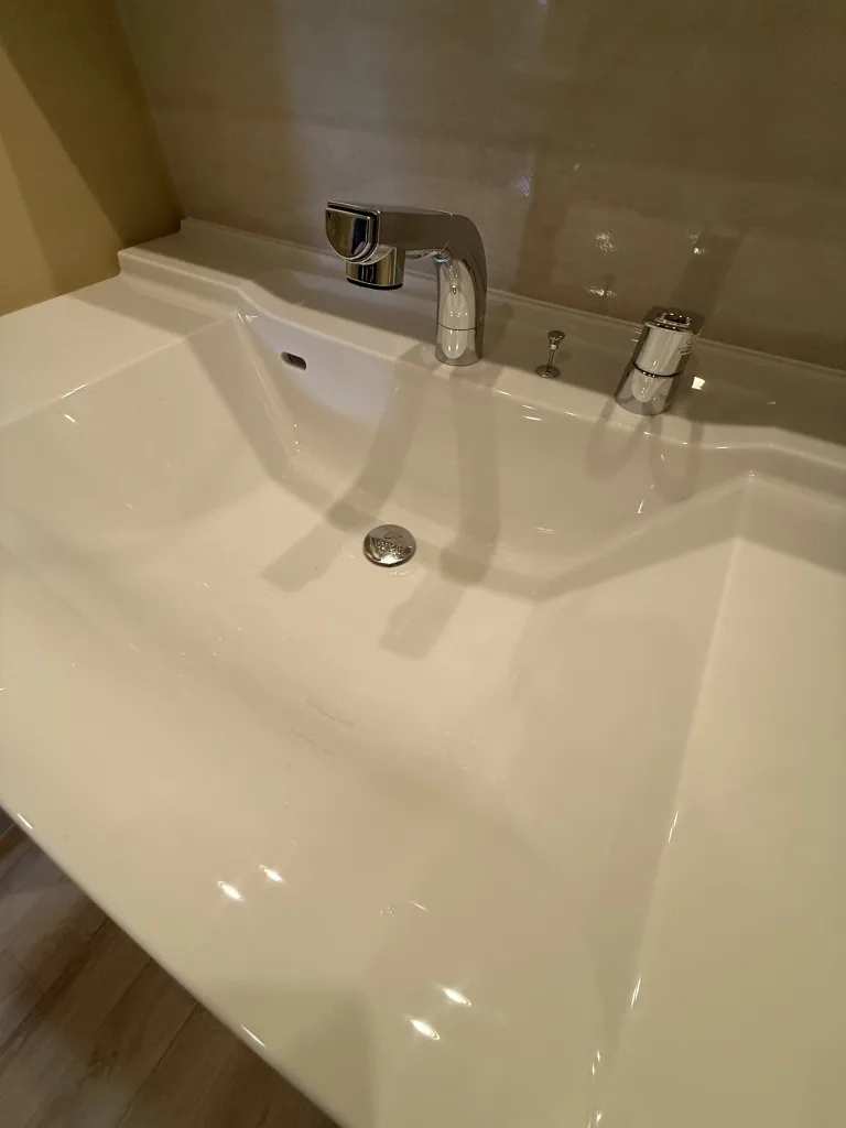 洗面ボウルが割れてしまったので、ご依頼をいただきました。お選びいただいた製品はタカラスタンダード製リジャストです。洗面台の幅が110cmで既製品ではご用意がない寸法でした。(一般的に洗面台の幅の規格は75cm、90cm、100cm、120cm)タカラスタンダード製リジャストは1cm刻みでサイズオーダーが出来る製品なので110cmでオーダーしました。