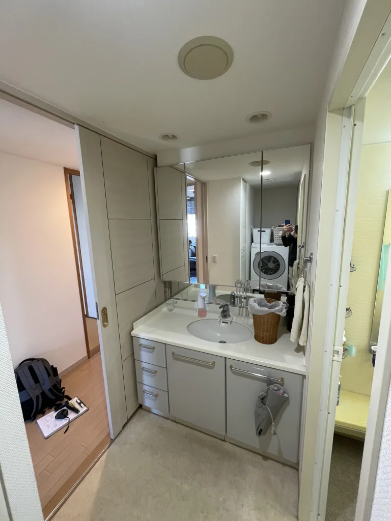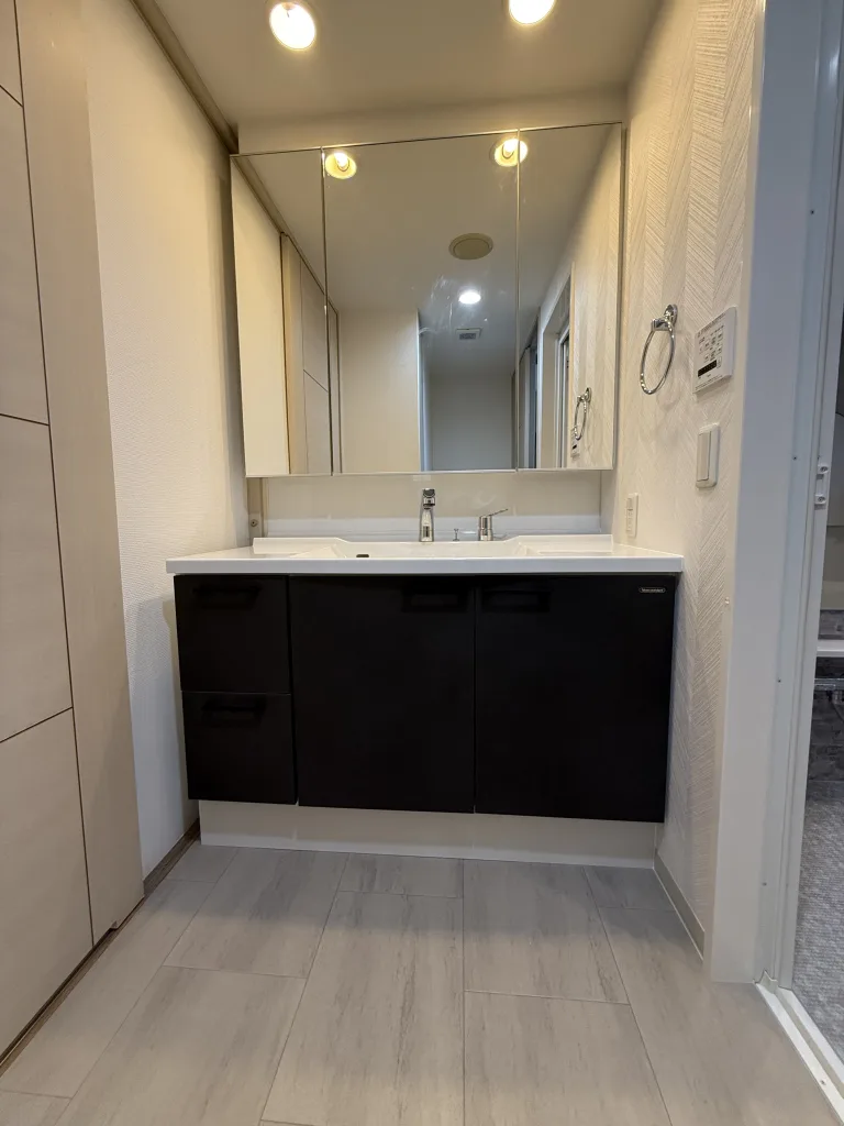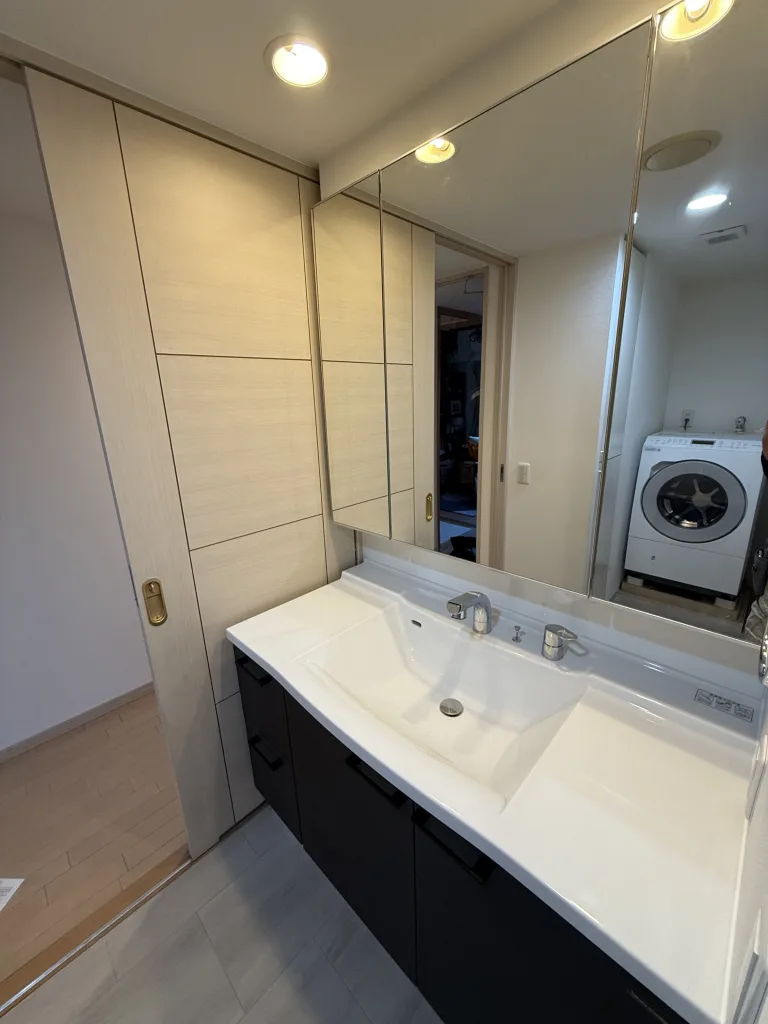 洗面所のリフォームもしました。製品はタカラスタンダード製リジャストです。3面鏡は既存利用です。