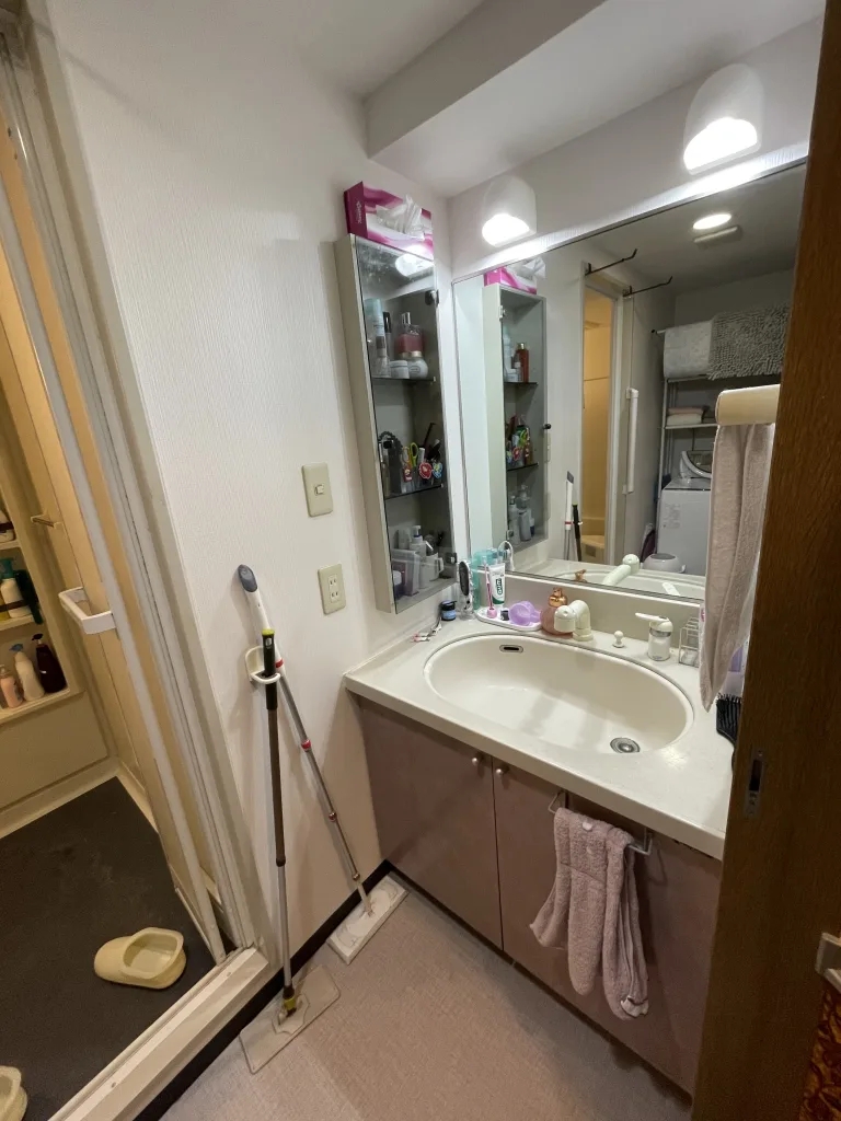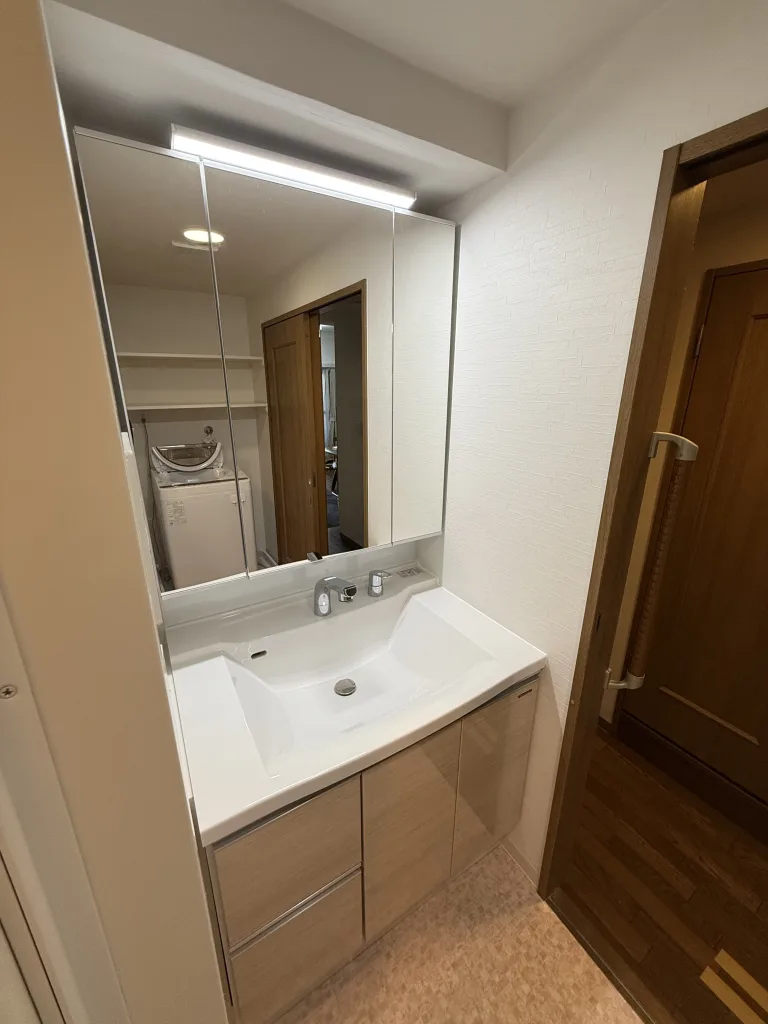 洗面所も洗面台交換から室内内装まで、丸ごとリフォームしました。洗面台はタカラスタンダード製リジャストです。既存の洗面台の幅が86cmで規格品の幅が入りませんでした。(洗面台のは幅の規格品は75cm、90cm、100cm、120cm)タカラスタンダード製リジャストは1cm刻みでサイズオーダーができる製品なので86cmで作成しました。